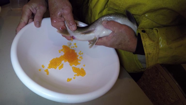 With the assistance of the MNR, the volunteers from our hatchery capture a few Haliburton Gold Lake Trout, to gather and fertilize eggs.